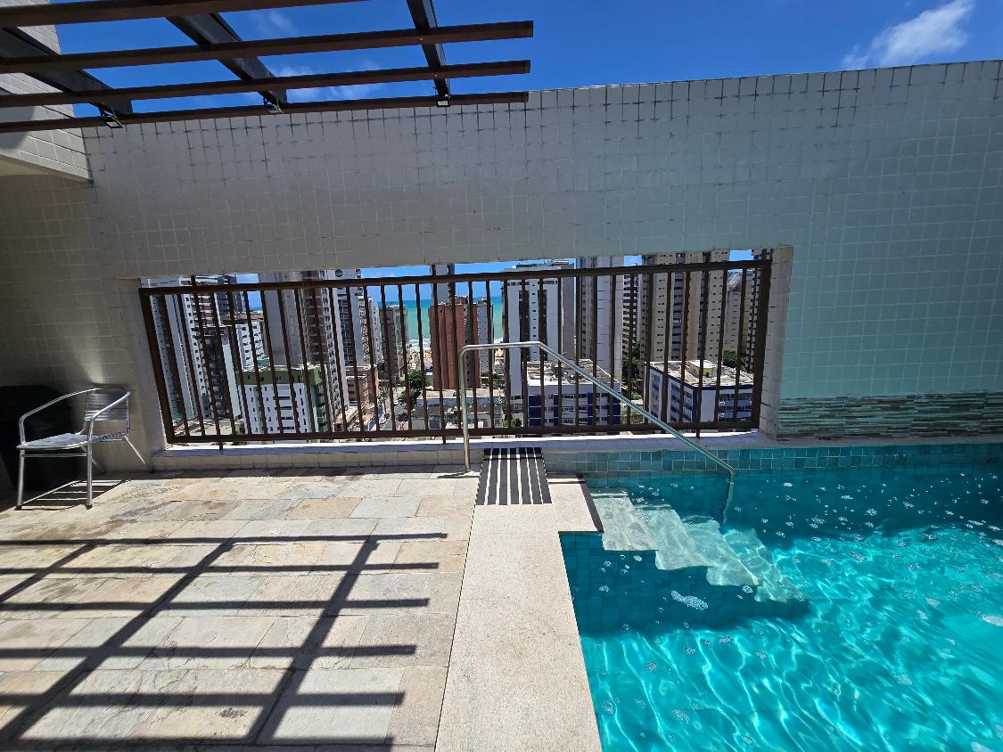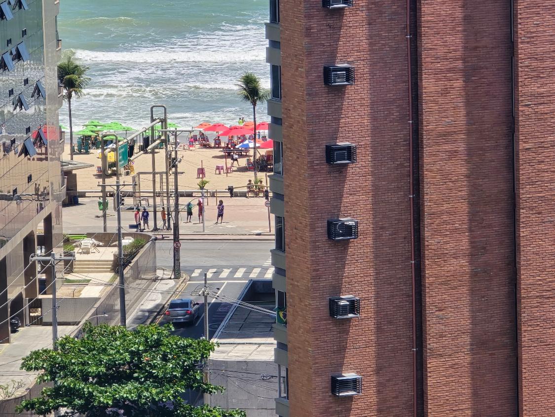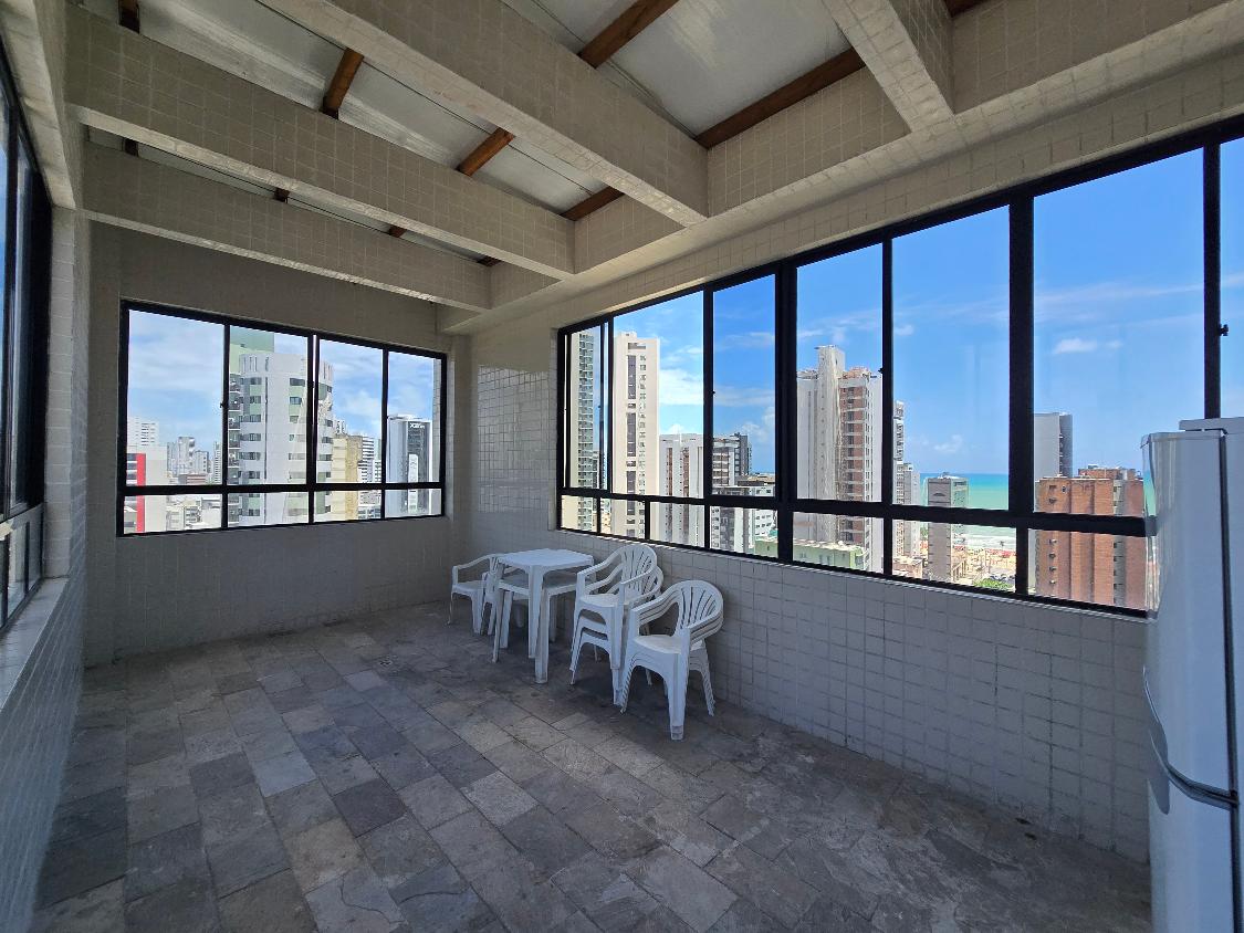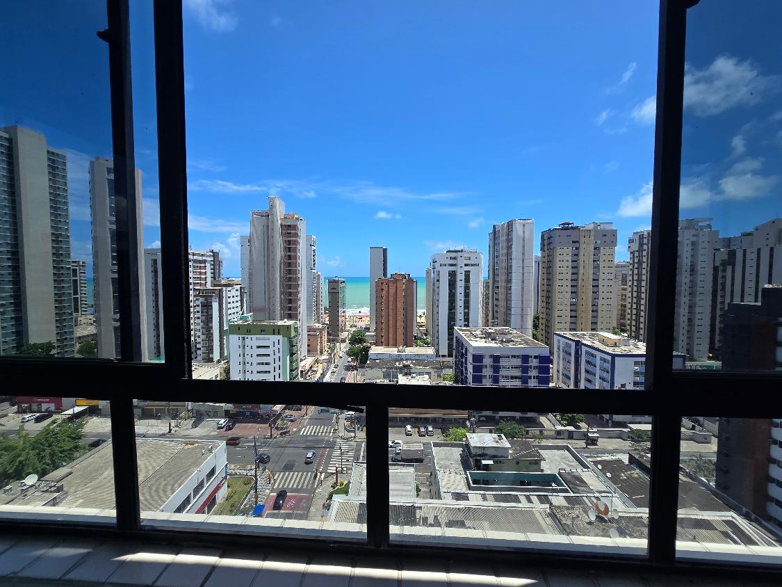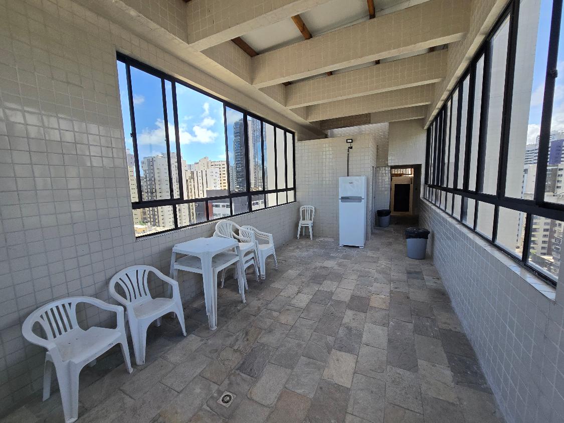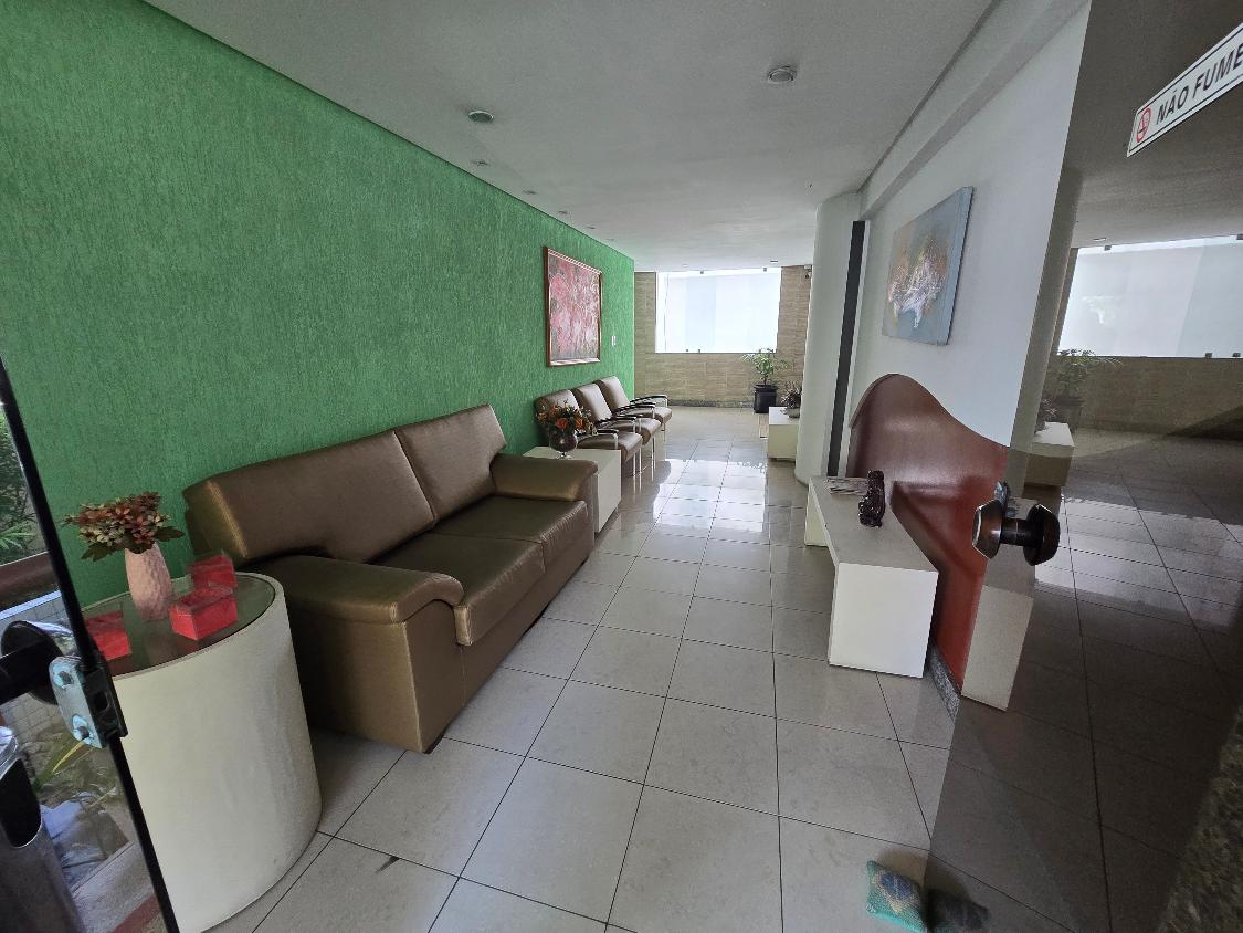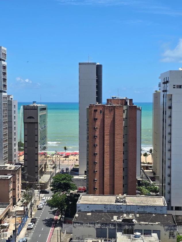 Flat 1 quarto com guarda roupas, wc social, sala ampla com janelão nascente, bastante ventilado, cozinha americana com armários, 1 vaga garam, área lazer na cobertura com salão de festas e piscina, bela vista para o mar.