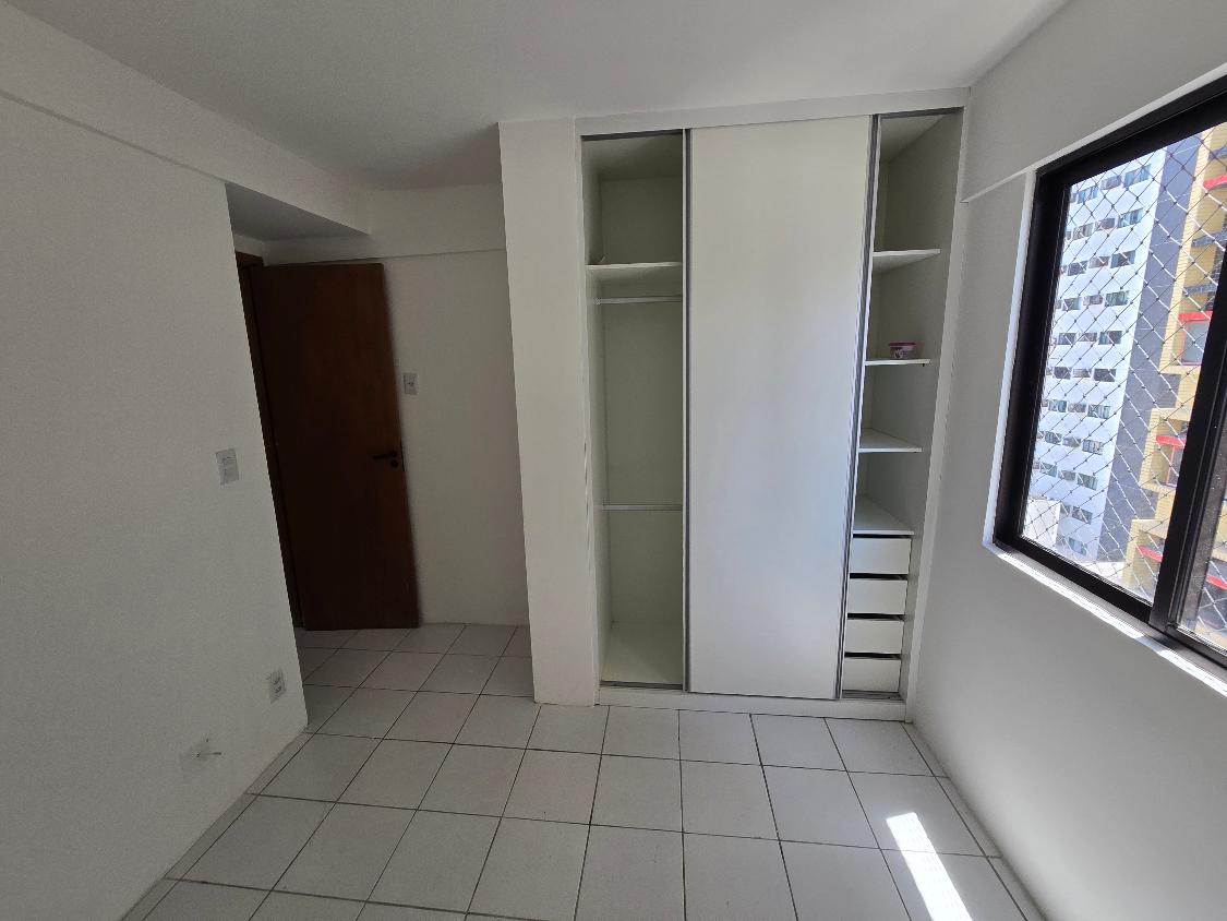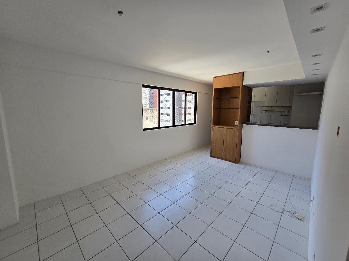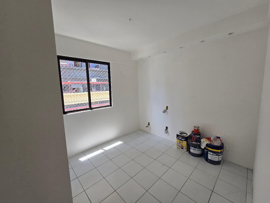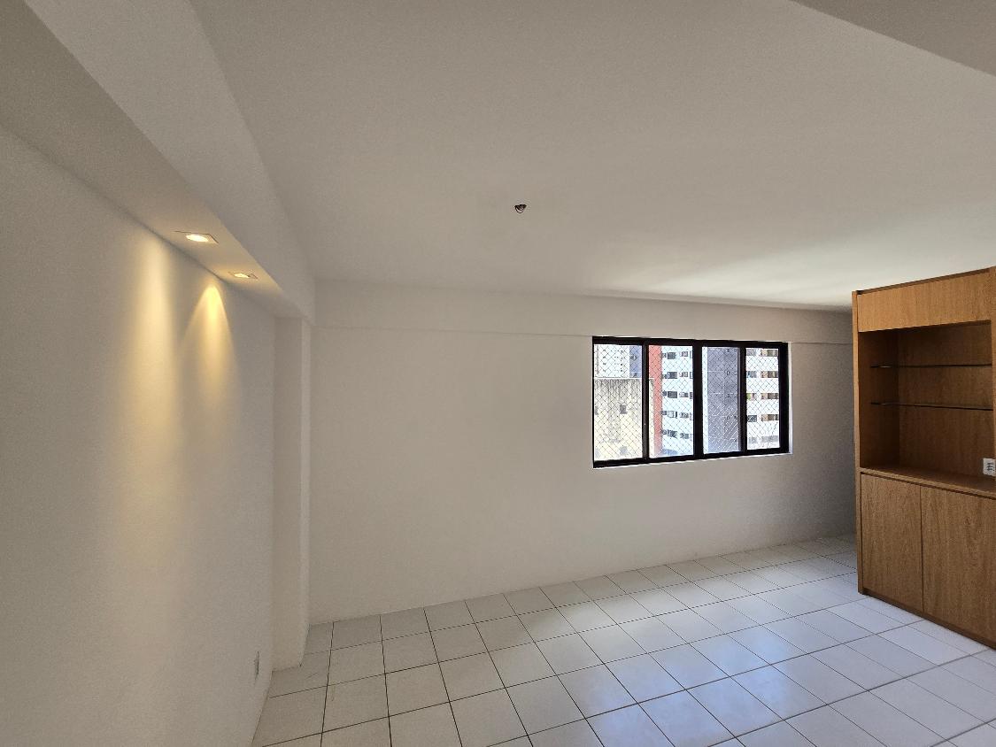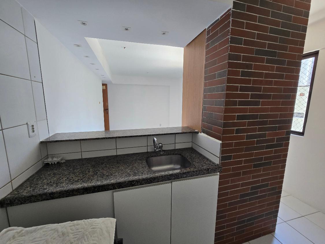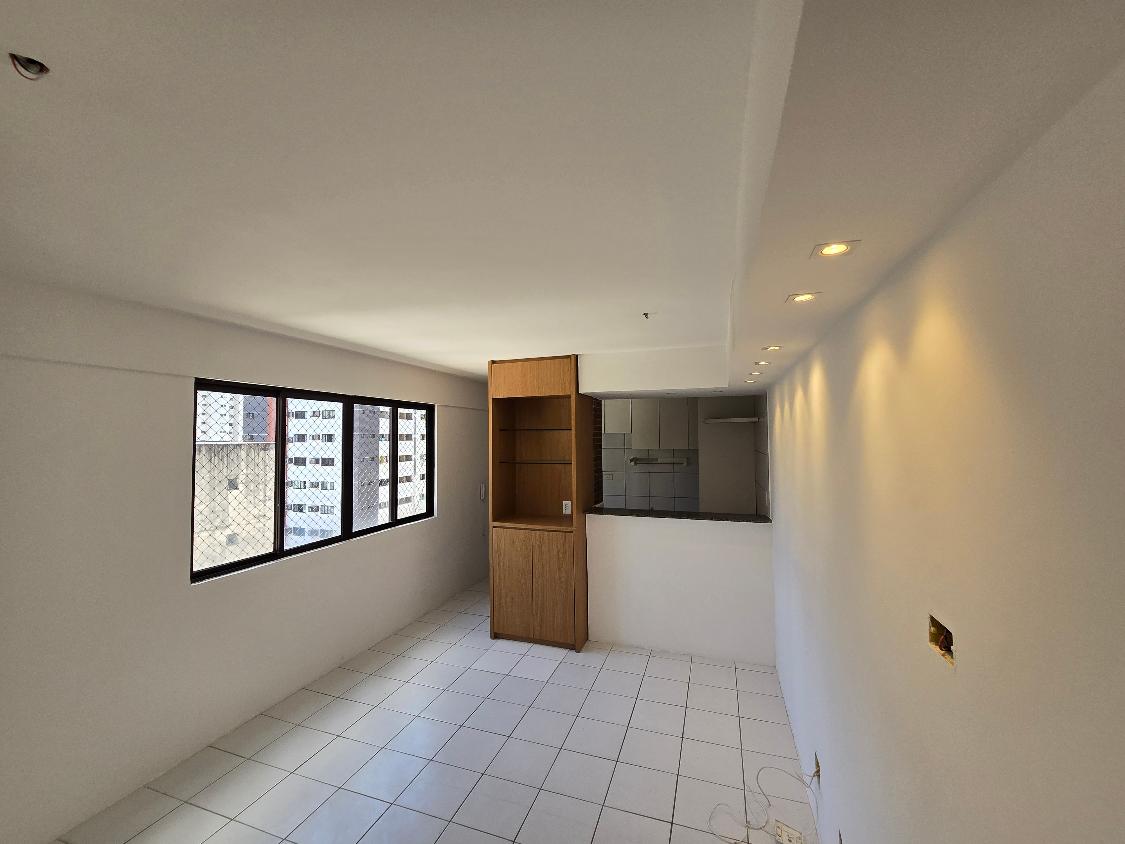 Flat 1 quarto com guarda roupas, wc social, sala ampla com janelão nascente, bastante ventilado, cozinha americana com armários, 1 vaga garam, área lazer na cobertura com salão de festas e piscina, bela vista para o mar.