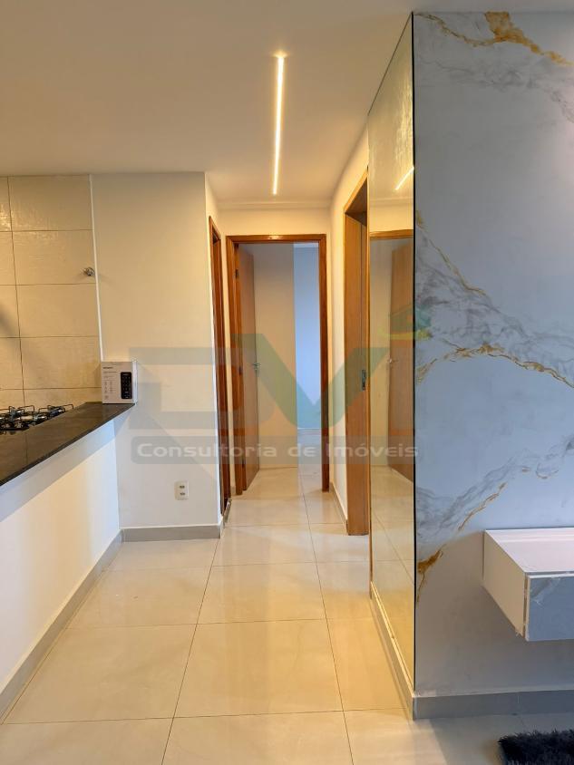 Apto 2 quartos, 1 suíte, wc social, sala, cozinha, área de lazer com salão de festas, piscina, 1 vaga coberta.